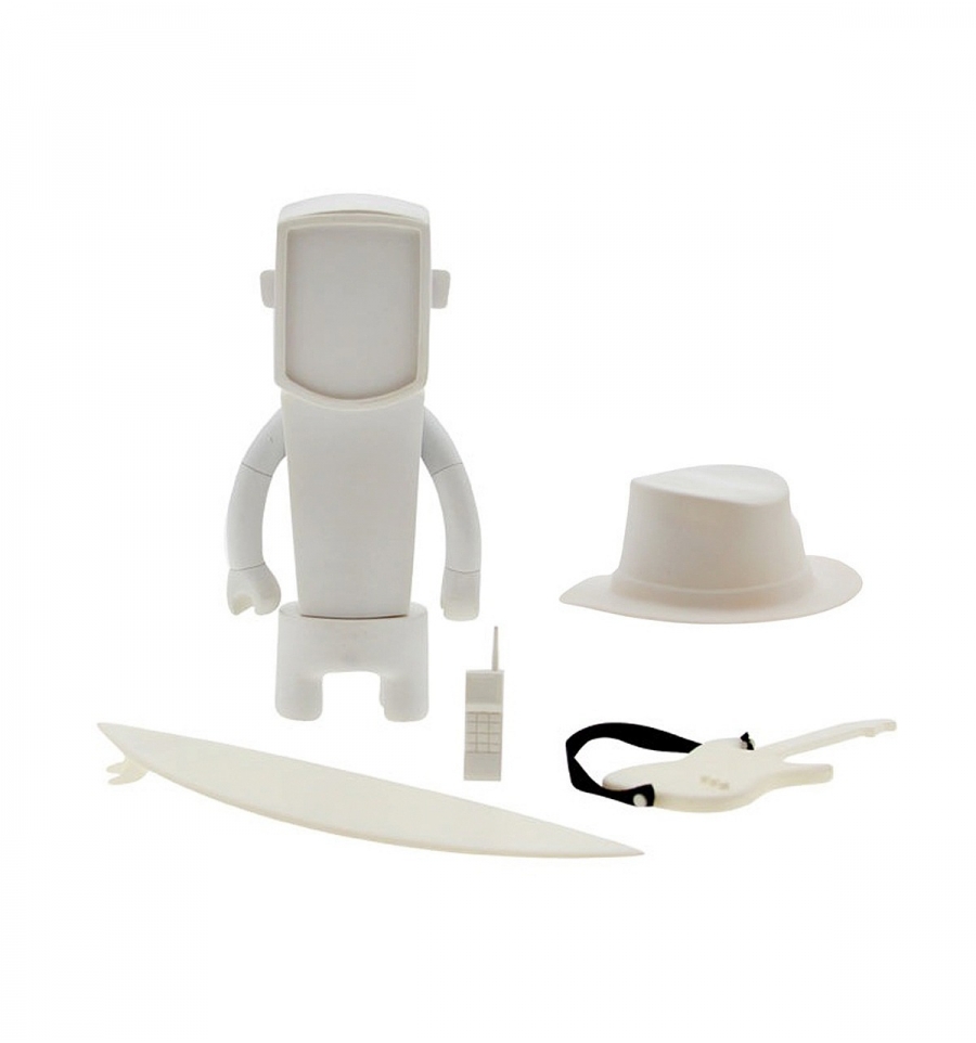 Art toy personalizable a tu gusto para hacer de él una figura 100% genuina. Podrás colorearlo, ponerle pegatinas y usar los accesorios incluidos: una tabla de surf, una guitarra eléctrica, un móvil o un sombrero. Además en su cara podrás colocarle la foto de carné que prefieras.