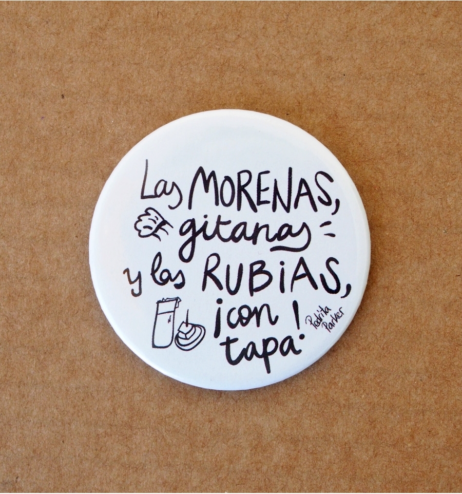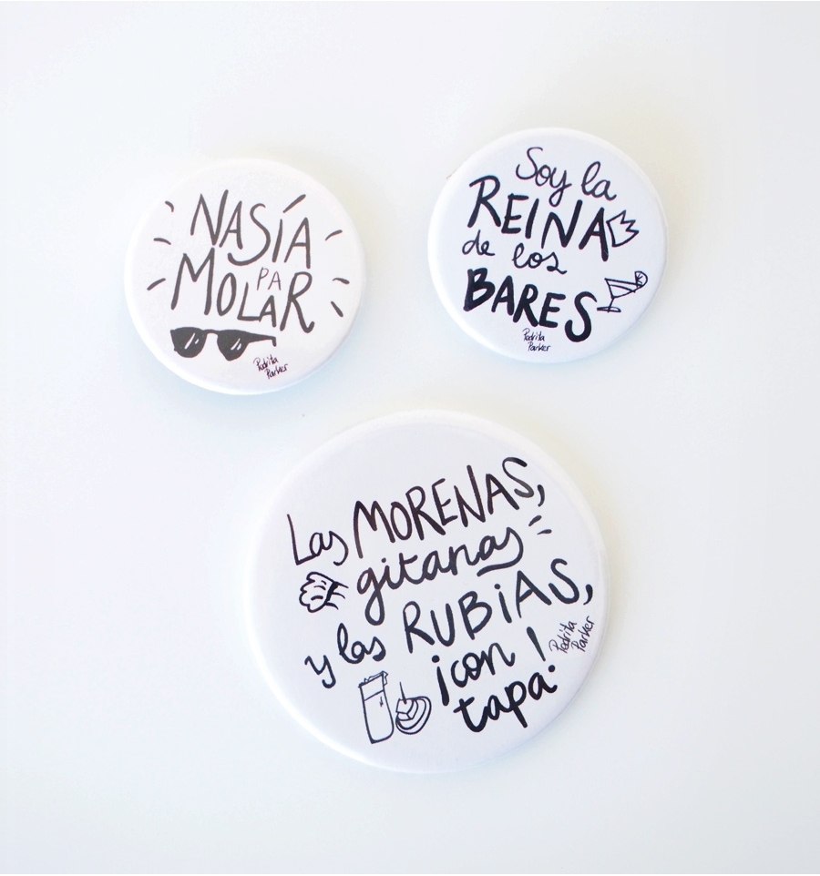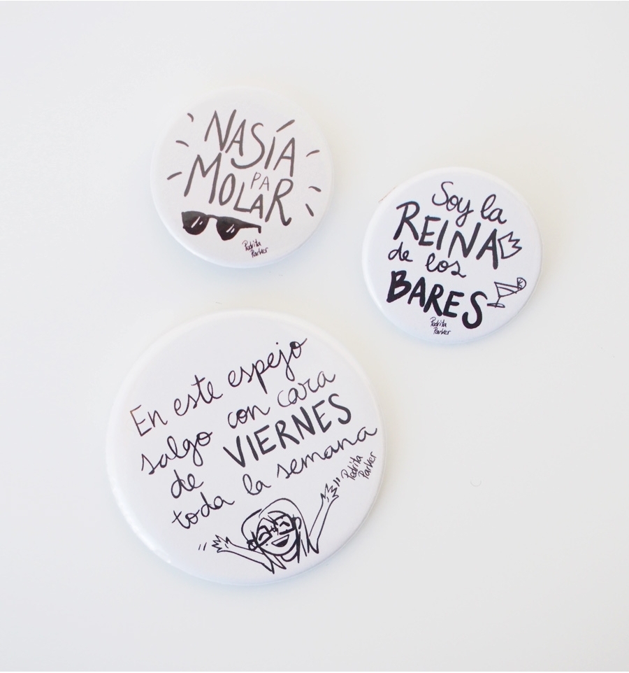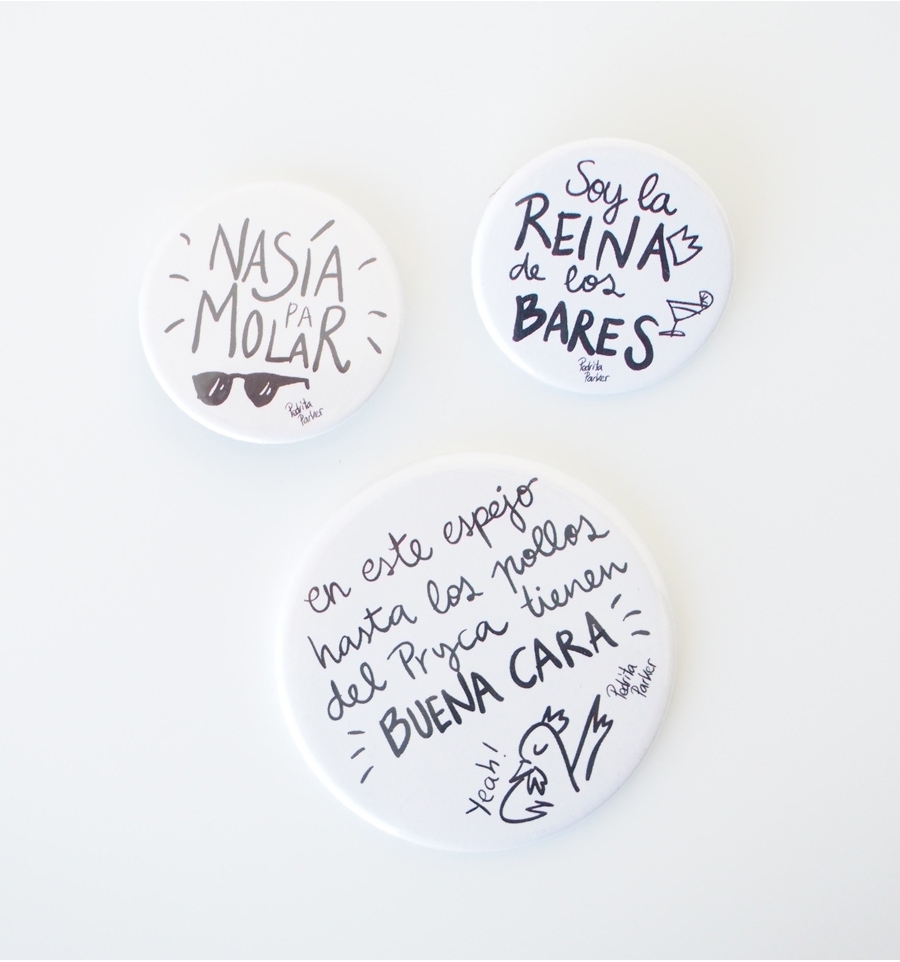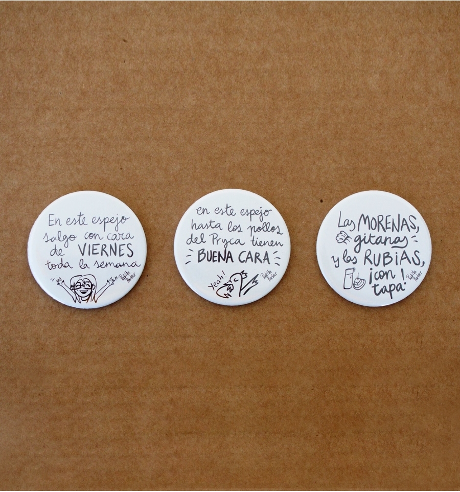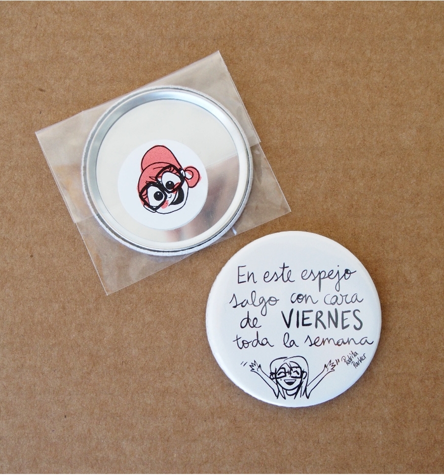Simpático kit de un espejo y dos chapas con divertidas frases originales de la ilustradora Pedrita Parker. Perfecto para llevar en tu bolso o en la solapa el buen rollo por bandera ;D